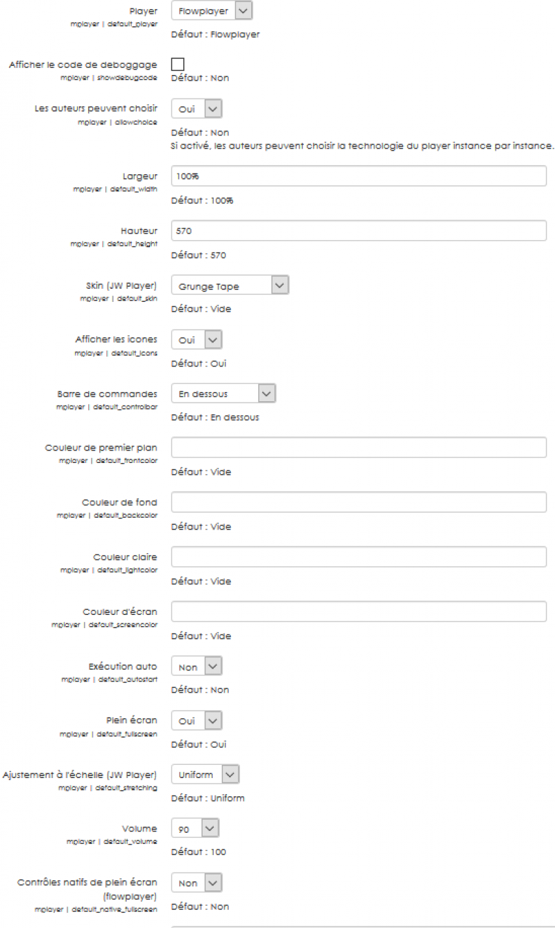 - Player (technologie) : Permet de choisir la technologie par défaut du player. Tous les players n'ont pas la même couverture de compatibilité, par exemple, le JW Player joue nativement des URL YouTube.