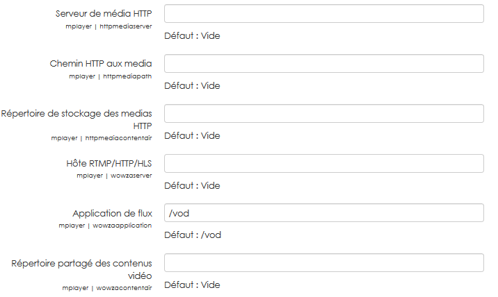 - Hôte RMTP/HTTP/HLS: L'url rtmp du serveur de flux. Dans le cas où le serveur de flux utilise le mode HLS (streaming sur HTTP) ou s'appuie sur une distribution via un plugin de pseudo-streaming H264, ce paramètre n'a pas d'utilité.