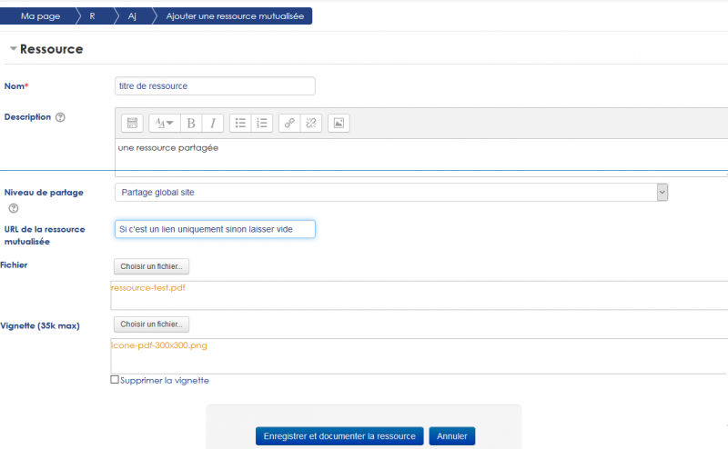 - URL de la ressource mutualisée : Lien vers la ressource , uniquement si c'est une ressource type lien, sinon laisser vide