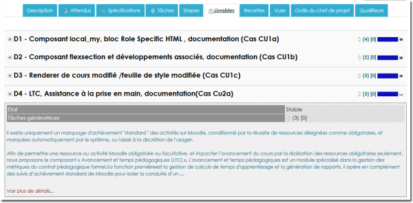 Les livrables dans le composant techproject peuvent s'afficher repliés ou dépliés avec leur descriptif. Ils sont préfixés D.