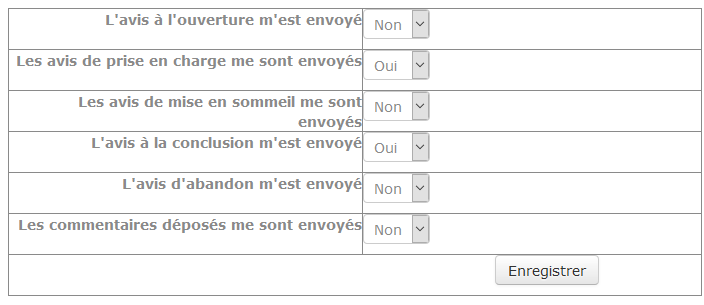 Les préférences déterminent quelles sont les notifications que vous validez lorsque vous créez une nouvelle entrée de défaut ou lorsque que vous vous abonnez à un défaut existant