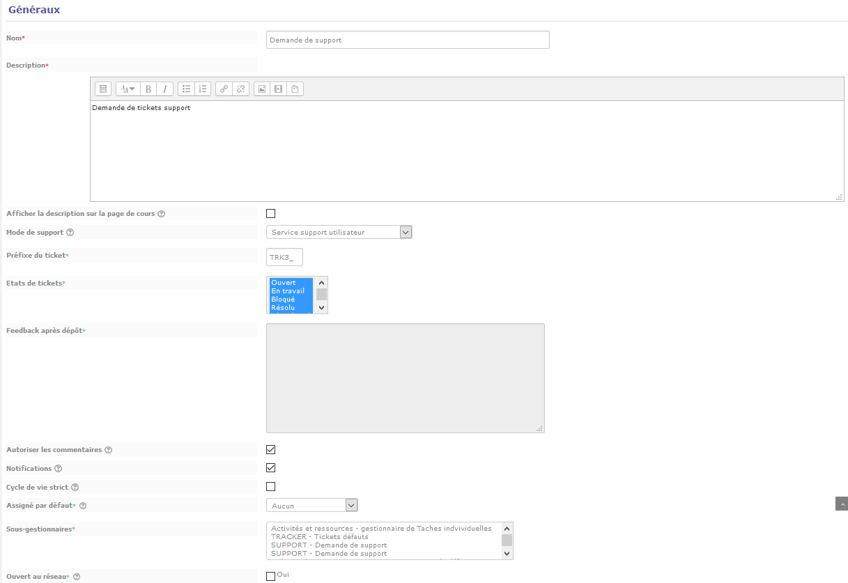 - Traqueur de défauts : Tous les utilisateurs du Tracker auront accès à tous les tickets disponibles. C'est à dire qu'ils pourront tous répondre aux demandes. Les états de tickets sont tous activés par défaut. Les états permettent d'afficher le statut de la demande traitée.