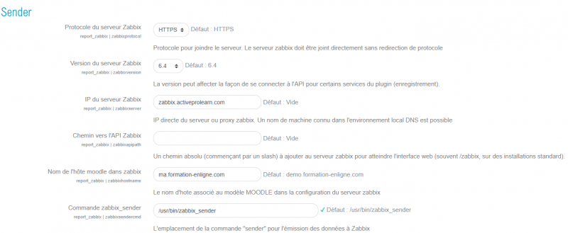 Commande zabbix_sender (zabbixsendercmd): L'emplacement de la commande “sender” pour l'émission des données à Zabbix. Défaut : /usr/bin/zabbix_sender