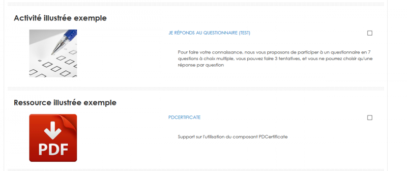 L'objectif est d' obtenir un rendu des vos activités et ressources sur vos cours avec une illustration de votre choix en lieu et place de l'icône standard Moodle. Par défaut cette illustration sera située coté gauche en regard de l'activité ou ressource concernée.