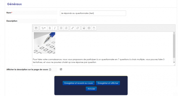 Choisissez ou non d'afficher le descriptif de votre activité ou ressource. Dans tous les cas, si une illustration existe, elle s'affiche à gauche en regard de l'activité ou ressource.