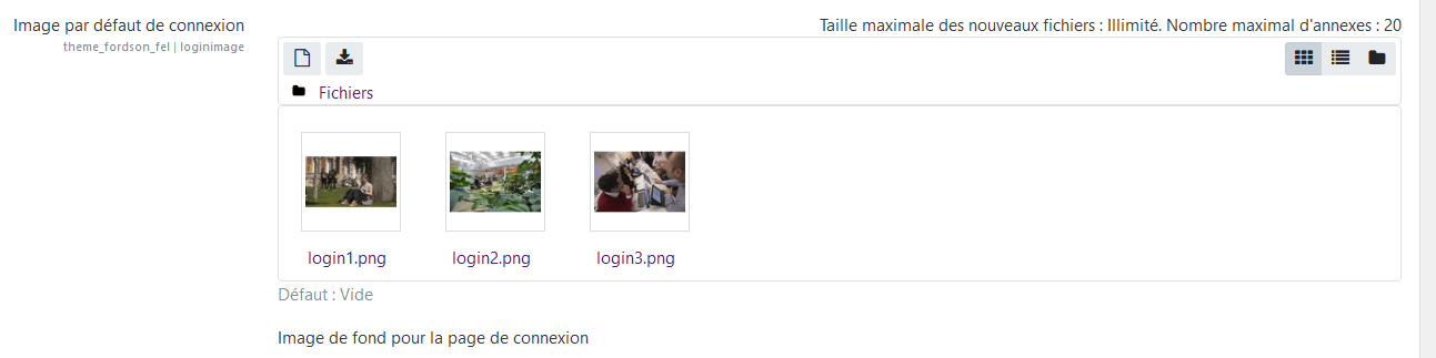 - Image par défaut de connexion: Image du fond de la page de login. Cet item à été modifié par APL pour accepter plusieurs images qui s'afficheront de façon aléatoire au chargement de la page de login.
