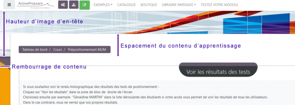 - Espacement du contenu d'apprentissage : Espacement entre le haut de la page et le contenu. placez une valeur inférieure à la hauteur de l'image bandeau de l'entête.
