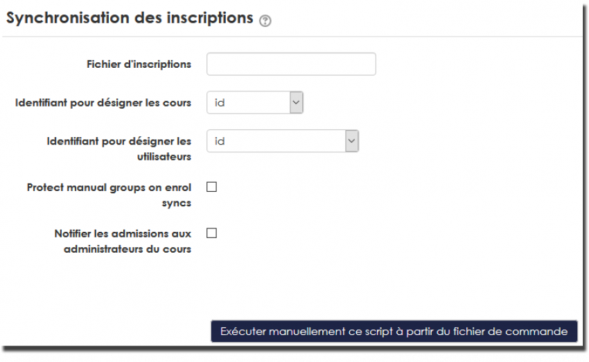 Vous pouvez alimenter ce fichier dans le répertoire <moodledata>/sync de l'extérieur. Il sera alors récupéré automatiquement dans le gestionnaire de fichiers de commande et exécuté par la tâche automatique.